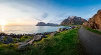 Stel je voor dat je jezelf bevindt aan een Noors strand tijdens de betoverende midzomer, wanneer de zon zich op haar hoogtepunt bevindt, maar nooit volledig ondergaat. Voor je ligt een majestueus tafereel: groene grasvlaktes leiden je naar gigantische rotsformaties die uit de aarde oprijzen. De zee strekt zich uit tot aan de horizon, waar de zon het middelpunt is en de achtergrond wordt gesierd door majestueuze bergen die de hemel raken onder een strakblauwe lucht.