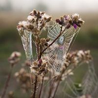 Vroeg opstaan kan je belonen met adembenemende natuurbeelden! Deze prachtige foto vangt het magische moment net na de mist, wanneer het ochtendgloren de delicate spinnenwebben en het paarse heidegebied verlicht. De dauwdruppels glinsteren als diamanten in het zachte ochtendlicht, waardoor elke draad van het web een kunstwerk op zich lijkt.