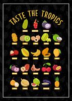 Dit kleurrijke bord toont een rijke selectie tropische vruchten zoals drakenfruit, ramboetan en guave. De illustraties nodigen je uit om de verschillende smaken van verre landen te leren kennen - een culinaire reis naar exotische streken.