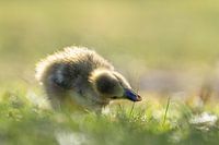 In deze vertederende foto zie je een ganzenkuiken dat vol verwondering de wereld ontdekt. Met zijn kleine snavel onderzoekt hij een grassprietje, badend in zacht ochtendlicht. De achtergrond vervaagt in dromerige tinten groen en geel, waardoor het kuiken volledig in de spotlight staat. De warme, natuurlijke sfeer van het beeld straalt rust en onschuld uit – perfect voor liefhebbers van natuur en dierenfotografie.