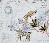 Nostalgische illustratie van een parkiet in een tropisch regenwoud op een tak met bloemen, pasteltinten en elementen van oude kaarten ronden het motief af tot een koloniaal beeld.
