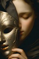 In het dramatische clair-obscur van de Caravaggio-stijl verschijnt het gezicht van een mooie vrouw in een indrukwekkende close-up. Het licht valt vanaf de zijkant scherp op haar gelaatstrekken en benadrukt de fijne contouren van haar huid, terwijl de achtergrond in diepe duisternis verzonken blijft. Met een sierlijke beweging tilt ze…