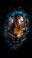 Een woedende tijger met brandende oranje ogen barst door een verbrijzelde blauwe muur. Een verbluffend beeld van explosieve kracht en woeste vastberadenheid.
