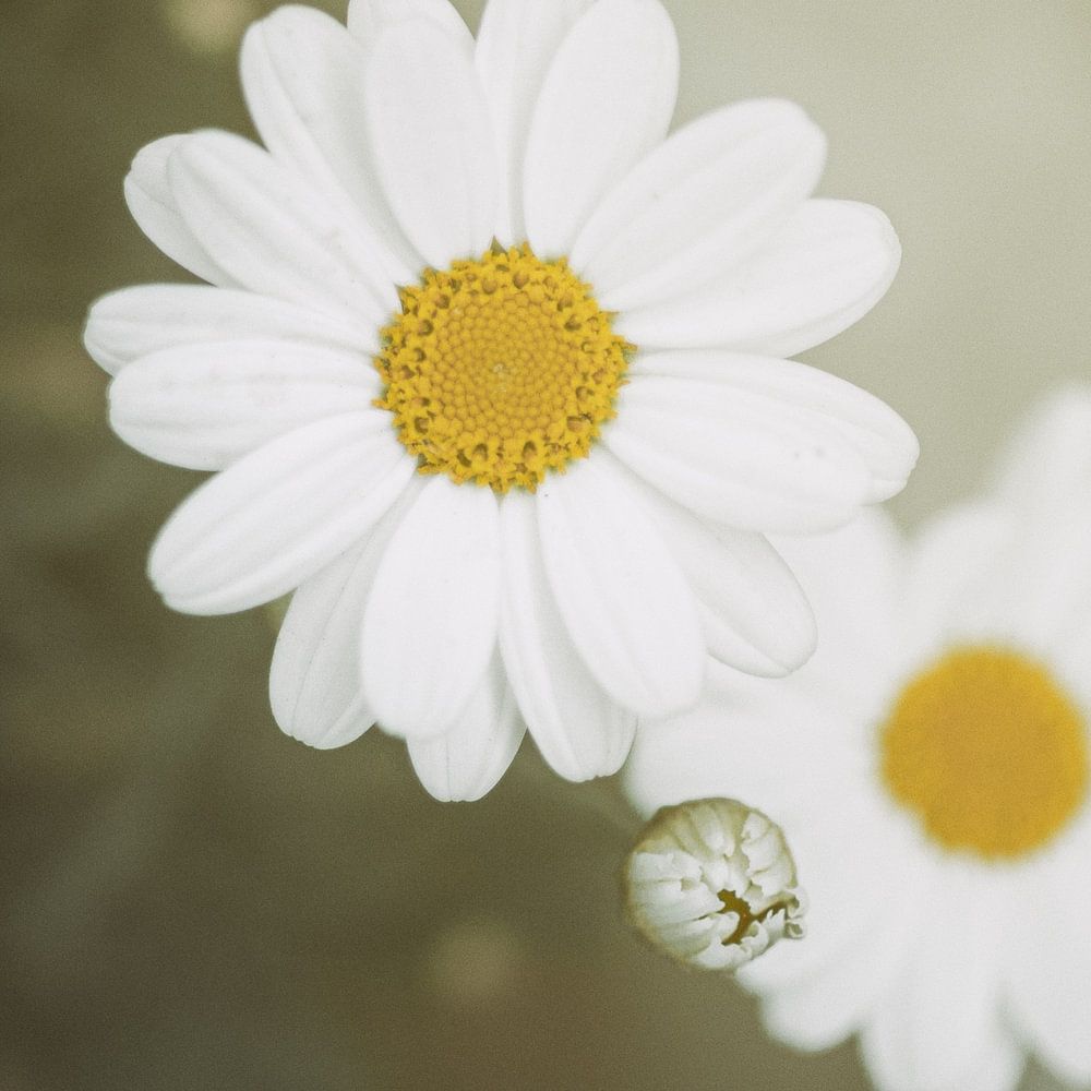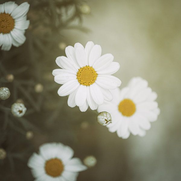 Fine art close-up van margrieten met een ondiepe scherptediepte. Het zachte focusverloop en het diffuse licht geven het beeld een kalme, minimalistische sfeer. Alsof de dag nog moet beginnen: zacht, stil en vol ruimte.