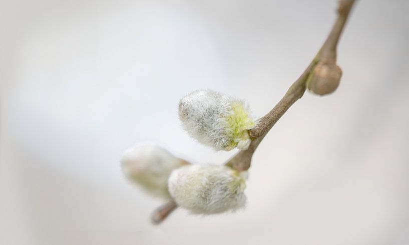 In het voorjaar komen de pluizige wilgenkatjes tevoorschijn. Onder het witte pluis zie je de eerste gele stampers, die over een paar dagen de katjes een heel ander aanzien geven. De witte achtergrond is de reflectie van zonlicht, gefilterd door de wolken, dat weerkaatst in het water