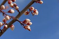 Zacht roze ontluikende bloesems van een amandelboom tegen een blauwe lucht