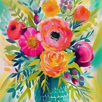 Een levendig schilderij voert de kijker mee naar het ontwaken in de lente van een kleurrijke vaas in bloei. De prachtige abstractie van roze tinten vult de kamer met een sfeer van vernieuwing en vitaliteit. Door de fijne penseelstreken lijken de bloemen levendig in beweging, alsof ze letterlijk naar de kijker toe wiegen. Elke bloem straalt een unieke levendigheid uit, van sterk magenta tot zachtroze, en brengt een speelse dynamiek in het beeld. De vaas zelf lijkt te schitteren in zijn eenvoud en tegelijkertijd in zijn pracht, een symbool van de schoonheid van de natuur en de kunst om deze te vereeuwigen. De artistieke interpretatie creëert een gevoel van hoop en een nieuw begin dat de geest verkwikt en de zintuigen aanspreekt. Dit kunstwerk belichaamt de pure vreugde van de lente, gevangen in een kleurenpalet van levendige roze tinten die de kamer vullen met warmte en leven. Het nodigt de kijker uit zich te laten inspireren door de energie van de lente en te genieten van de schoonheid van de natuur in al haar facetten.