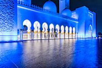 Na het avondgebed komen twee vrouwen samen. De Sheikh Zayed-moskee wordt 's avonds in het blauw verlicht. Het water ervoor geeft een mooie reflectie