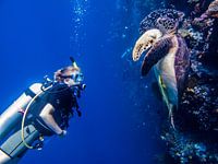 Dit is een van die bijzondere momenten dat mens en dier samenkomen. De schildpad besluit lucht te gaan happen en zwemt uiterst rustig in haar sierlijke stijl richting de oppervlakte. Haar enigszins kwetsbare buik naar de duiker toegekeerd. Een moment om nooit meer te vergeten