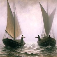 Twee zeilschepen naderen elkaar in een dichte mist, terwijl een man en een vrouw hun handen naar elkaar uitstrekken, gevangen in een moment van verlangende verbinding. De stilte en mysterie van de mistige zee versterken de romantische en hoopvolle sfeer van dit schilderij. Het roept gevoelens op van gemiste kansen en de zoektocht naar verbinding.