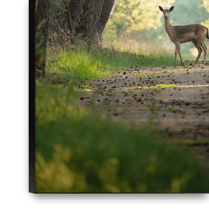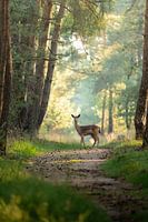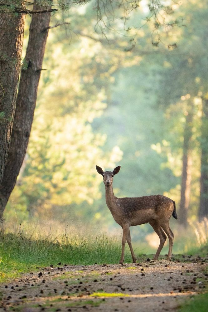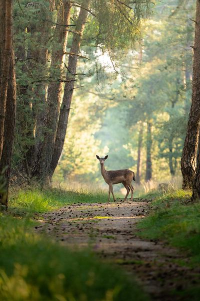 In het zachte ochtendlicht van het bos staat een damhert stil op een smal bospad tussen de hoge dennen. De zonnestralen vallen speels door de bomen en verlichten het pad terwijl het hert nieuwsgierig om zich heen kijkt. Het moment voelt bijna magisch – een stille ontmoeting midden in de natuur.