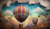 Grafische compositie van graffiti die heteluchtballonnen voorstelt die opstijgen achter een gedeeltelijk vernielde bakstenen muur. Het idee is om een zeer originele manier te bieden om voorbij de ondoorzichtige grenzen van het materiaal te ontsnappen. Het contrast tussen deze oude muur die wordt afgebroken, met zijn doffe kleuren, en de kleurrijke luchtballonnen die de lucht in gaan in een tropisch landschap versterkt het idee van vrijheid en lichtheid voorbij starre verschijningen.