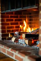 Een warm, uitnodigend vlammenspel danst tussen knisperende houtblokken, terwijl levendige sintels het hart van de kamer verlichten. De rustieke bakstenen gevel ziet eruit als een omarming uit het verleden en creëert een gezellige sfeer. Hier vermengen de geur van brandend hout en het rustgevende geknetter zich met het verlangen naar gezellige avonden.