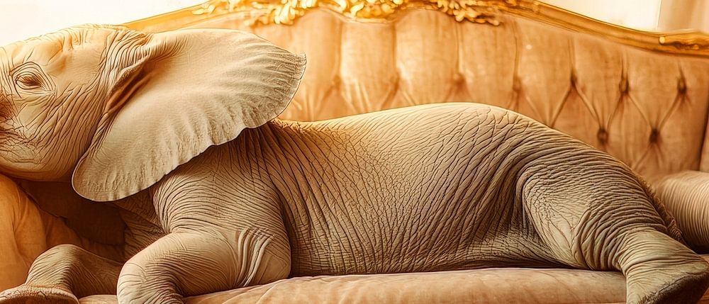 Een vriendelijke olifant ontspant op een elegante, met goud versierde bank en geeft de kamer een charmant, grillig tintje. Het harmonieuze kleurenpalet en ontwerp creëren een uitnodigende sfeer. Deze foto is perfect voor een woonkamer waar verbeelding en stijl samenkomen om memorabele gesprekken te creëren.
