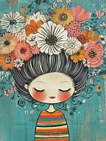 Ontspannen vrouw met bloemenkrans - In dit vrouwen schilderij zie je een vrolijke vrouw met een grote bloemenkrans op haar hoofd, gekleed in een gestreepte trui, wat een ontspannen en blije sfeer oproept.