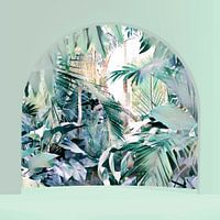 Het uitzicht is door de boog naar het bos gericht. Ik heb dit kunstwerk gerealiseerd met een schilderij van mij en eenvoudige architectonische boogelementen.