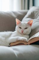 Een ontspannen, sneeuwwitte kat krult zich gezellig op een open boek, terwijl zacht licht de kamer verlicht. Zijn verveelde maar charmante uitdrukking nodigt je uit om te blijven hangen en te dromen. Dit schilderij brengt warmte en rust in elke woonkamer en creëert een uitnodigende sfeer. Perfect voor kattenliefhebbers en boekenwurmen!