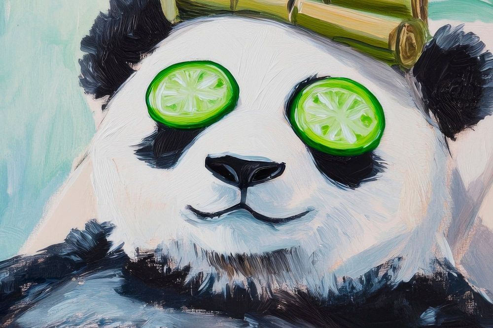 In een lucht van zachtgroene tinten drijft een ontspannen panda op een ligstoel, zijn gezicht bedekt met komkommerschijfjes. Een kleine verzameling bamboestokken troont op zijn hoofd, terwijl de geur van vrede en sereniteit door de lucht zweeft. Dit is waar pure ontspanning en betoverende natuur elkaar ontmoeten.