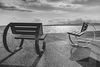 Zomeravond aan het Gardameer met twee lege gedesignde stoelen aan de waterkant. Uitzicht op het water met laag hangende zon.