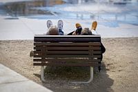 Een echtpaar ontspant zich op een bankje in het stadscentrum van Swinoujscie aan de Oostzee in Polen en voert een zorgeloos gesprek