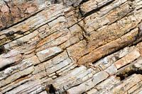 Een gelaagde rots structuur net boven de zeen aan de kust van Rabbit Island, Turkije in de kleuren oranje, wit en grijs.