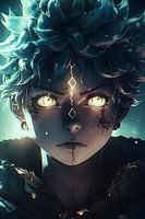 Een jonge held met weerbarstig groen haar en gloeiende amberkleurige ogen. Gloeiende geometrische tekens knisperen over zijn gezicht, wat duidt op een immense verborgen kracht. De donkere, gruizige sfeer benadrukt zijn vastberadenheid en het gewicht van zijn lot.