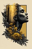 Dit krachtige artwork vangt een moment van rust, verbondenheid en zelfreflectie. In een verfijnde dubbele-exposure versmelten het profiel van een vrouw, weelderige bloemen en een mystiek boslandschap tot één harmonieus geheel. De warme goudtinten contrasteren prachtig met het diep zwart, wat het werk een tijdloze en elegante uitstraling…