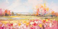 "Ontwaken van de Lentevallei" is een digitale expressie van de overgangsperiode waarin de natuur ontwaakt uit haar winterslaap. Dit werk is doorspekt met een spectrum aan levendige kleuren: van de tedere roze en witte tinten in de bloeiende voorgrond tot de gouden en amberkleurige tonen die het landschap op de achtergrond schilderen. Elke digitale penseelstreek lijkt de opwinding van het nieuwe seizoen te weerspiegelen, met vegen die de velden en de heldere lucht erboven vastleggen. De kunstenaar heeft de bloei van de lente vastgelegd op een manier die de kijker uitnodigt om dieper in te gaan op de fijnere details van de natuur. De inspiratiebron was het eerste zicht van een landschap in bloei, met een sfeer die even fris als troostend is. Deze creatie, met haar vloeiende overgangen en zachte contouren, straalt een gevoel van vrede en begin uit, en brengt een boodschap van hoop en groei. In elk interieur brengt het werk een vleugje lente binnen, ideaal voor wie zijn ruimte wil verrijken met een kunstwerk dat zowel kalmeert als inspireert.