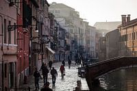 Eerste licht in de straten van de wijk Cannaregio in de Italiaanse stad Venetië waar het stadsleven langzaam op gang komt. Winkels hebben de straat geschrobd en de natte stenen reflecteren in het eerste zonlicht.