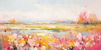 Deze compositie is tot leven gebracht met digitale borstelstreken die zowel precisie als expressieve vrijheid suggereren, en toont de kenmerkende levendigheid van bloesems en velden. Reflecties in het water voegen diepte en dimensie toe, terwijl de gelaagdheid van de verf en het lichtspel de kijker uitnodigen voor een langer bezoek. De kunstenaar heeft zich laten inspireren door de schoonheid van de ontluikende natuur, en heeft dit vertaald in een werk dat optimisme en groei uitademt.