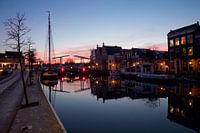 Het staartje van het blauwe uurtje boven de Gravestenebrug en het Spaarne in Haarlem. De lucht boven de horizon kleurt al roze door de naderende zonsopkomst.