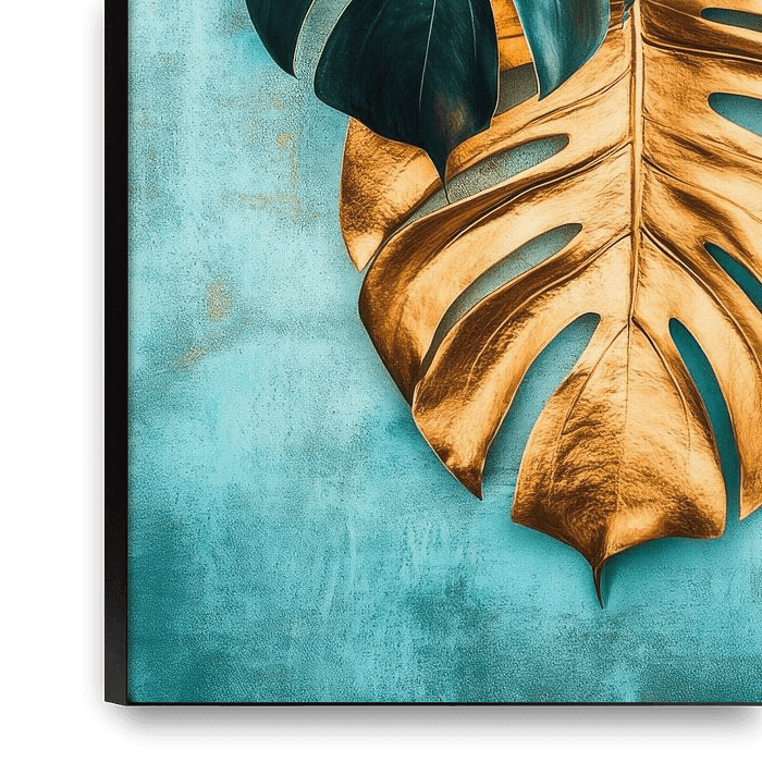 Hier ontvouwt zich een fascinerend samenspel van kleuren en texturen: De weelderige bladeren in diep, rijk groen smelten samen met een lichtgevende gouden tint. Deze tropische reuzen lijken als levende kunstwerken te dansen tegen een zachte, aquagroene achtergrond en belichamen een vleugje exotische elegantie en stijlvol contrast.