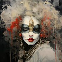Masker Extravagant - Dit schilderij toont een portret gehuld in de mysterie van een sierlijk masker, geaccentueerd met goud en zilver, dat speelt met thema's van geheimzinnigheid en verhulde emoties. De stijl is een moderne fusie met een vleugje barok, gebruikmakend van een gedempt kleurenpalet met uitbarstingen van rood, waardoor het…