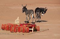 Twee ezels komen op bezoek bij een kamp middenin de woestijn in Zuid Marokko.