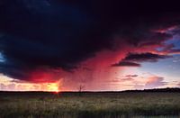Dramatische onweersbui over moerassen tijdens de zonsondergang, Fochteloerveen, Nederland