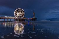 Scheveningse Pier weerspiegeld in the natte zand van Noorderstrand van Scheveningen en een onweersbui die overtrekt