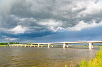 Stormwolken boven het Reevediep, de bypass van de IJssel, bij Kampen in de IJsseldelta. De donkere wolk met donder en bliksem komt snel dichterbij over het groene landschap met de Nieuwendijkbrug in het midden.