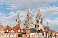Tournai Belgium The Cathedral of Our Lady (Notre-Dame de Tournai, Onze-Lieve-Vrouw van Doornik), or Tournai Cathedral towers over Grand Place church, building, spires, Unesco, world Heritage, site,