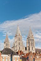 Tournai Belgium The Cathedral of Our Lady (Notre-Dame de Tournai, Onze-Lieve-Vrouw van Doornik), or Tournai Cathedral towers over Grand Place church, building, spires, Unesco, world Heritage, site,
