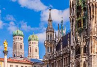 Marienplatz in München met de Mariensäule, de Frauenkirche en het Nieuwe Stadhuis met het Glockenspiel.