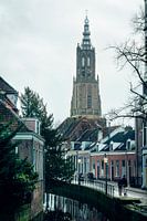 Een mooi kijkje in Amersfoort, met de langegracht op de voorgrond en de Onze Lieve Vrouwetoren op de achtergrond.