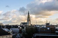Hoogtefoto vanaf een balkon in de wijk Schorsmolen met uitzicht op de Grote Kerk tijdens een zomermiddag met een mooie wolkenlucht.
