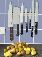"Onze keuken" is een digitaal kunstwerk dat de intimiteit en precisie van het dagelijks koken op poëtische wijze vastlegt. De compositie toont een detailrijke uitsnede van een keukenscène, waarbij de achtergrond wordt gevormd door koelblauwe muurtegels die een gevoel van rust en orde oproepen. Tegen deze wand hangt een metalen magneetstrip waarop zeven messen met zorg en symmetrie zijn gerangschikt. De verscheidenheid aan lemmeten suggereert een liefde voor koken, waarbij het robuuste mes met het opschrift "Sabatier" als pronkstuk fungeert. Deze naam verwijst naar het gerenommeerde Franse messenmerk en verraadt de toewijding van de gebruiker aan zijn culinaire ambacht.