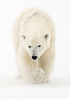 Ah, daar heb je 'm dan, de koning van de Noordpool. Wat meteen opvalt, is de doordringende blik van deze ijsbeer die recht op je af lijkt te lopen. Je voelt bijna de koude arctische wind in je gezicht. Maar let ook op de subtiele details: de ijskristallen op zijn vacht en het zachte licht dat de besneeuwde omgeving verlicht.