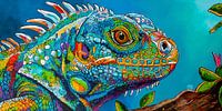Dit originele kunstwerk, geschilderd met acryl op een indrukwekkend formaat van 140 x 70 cm, toont een close-up portret van de majestueuze leguaan in al zijn kleurrijke glorie.