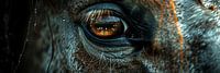 Het oog is groot en helder, met een diepbruine iris die een reflectie van het omringende landschap vangt. Deze reflectie creëert een fascinerend beeld binnen het oog, alsof de wereld van het paard en de buitenwereld samenkomen. De textuur van de huid rondom het oog is duidelijk zichtbaar, met fijne haartjes en subtiele kleurveranderingen die bijdragen aan de realistische en gedetailleerde weergave.