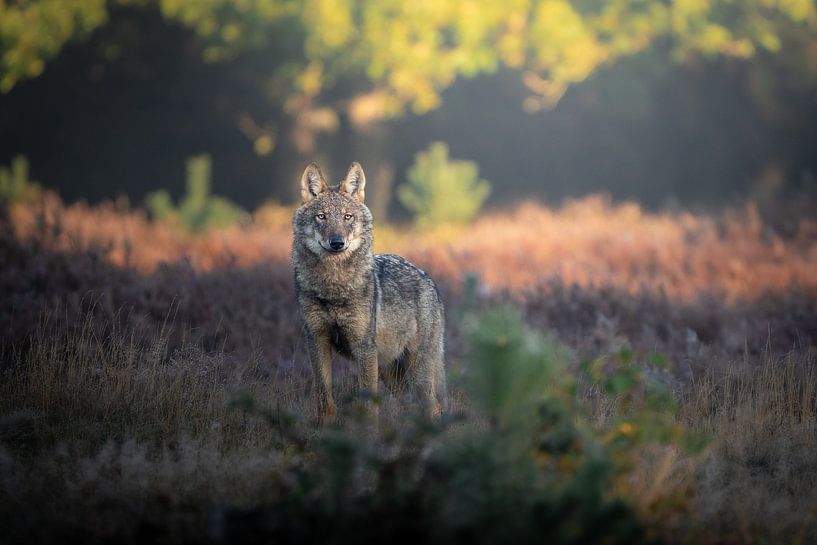 In het zachte ochtendlicht staat een wolf stil in het open landschap. Zijn alerte blik en rechtopstaande houding verraden de kracht en intelligentie van dit indrukwekkende dier. Even lijkt het alsof je elkaar aankijkt — een zeldzaam en intens moment midden in de natuur.