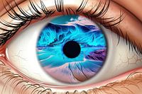 Oog in oog met abstractie is een digitaal kunstwerk waarin de iris van het oog wordt gebruikt als canvas voor een abstract kunstwerk. Het is een spel van vormen, lijnen en kleuren die met elkaar verbonden zijn.