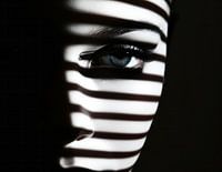 De krachtige compositie wordt gekenmerkt door horizontale strepen van helder licht die het gezicht van de persoon doorsnijden, waardoor een contrastrijk spel van licht en schaduw ontstaat. Dit zorgt voor een bijna zebra-achtig patroon dat over de huid en de contouren van het gezicht loopt, en legt de nadruk op het enige zichtbare en doordringende oog.