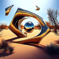In het hart van een oneindige woestijn, waar de werkelijkheid wankelt onder de hitte van onzichtbare zonnen, staat het oog van de fata morgana als een mysterieuze poort. In het midden zweeft een perfecte chromen bol die de hele horizon weerspiegelt - zowel de wereld voor je als de wereld daarachter. De gebroken, met goud omrande structuur eromheen glinstert als een halfvergeten visioen en werpt scherpe schaduwen op het droge zand.